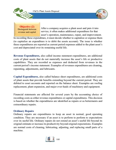 Ch(5): Plant Assets Disposal110After a company acquires a plant asset and puts it intoservice, it often makes additional expenditure for thatasset%u2019s operation, maintenance, repair, and improvement.In recording these expenditure, it must decide whether to capitalize or expense them (to capitalize an expenditure is to debit the assets account). The issue is whether these expenditures are reported as current period expenses added to the plant asset%u2019s costand depreciated over its remaining useful life. Revenue Expenditures,also called income statement expenditures, are additional costs of plant assets that do not materially increase the asset%u2019s life or productive capabilities. They are recorded as expenses and deducted from revenues in the current period%u2019s income statement. Examples of revenues expenditures are cleaning, repainting, adjustments, and lubricants.Capital Expenditures,also called balance sheet expenditures, are additional costs of plant assets that provide benefits extending beyond the current period. They are debited to asset accounts andreported on the balance sheet. Examples are roofing replacement, plant expansion, and major over-hauls of machinery and equipment.Financial statements are affected for several years by the accounting choice of recording costs as either revenue expenditures or capital expenditures. This decision is based on whether the expenditures are identified as repairs or as betterments and extraordinary repairs.Ordinary RepairsOrdinary repairs are expenditures to keep an assetin normal, good operating condition. They are necessary if an asset is to perform to perform to expectations over its useful life. Ordinary repairs do not extend an asset%u2019s useful life beyond its original estimate or increase its productivity beyond original expectations. Examples are normal costs of cleaning, lubricating, adjusting, and replacing small parts of a machine. Objective (2)Distinguish between revenue and capital
