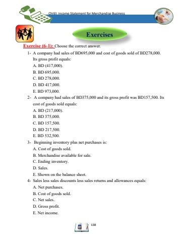 Ch(6): Income Statement for Merchandise Business138Exercise (6-1): Choose the correct answer.1-A company had sales of BD695,000 and cost of goods sold of BD278,000. Its gross profitequals:A.BD (417,000).B.BD 695,000.C.BD 278,000.D.BD 417,000.E.BD 973,000.2-A company had sales of BD375,000 and its gross profit was BD157,500. Its cost of goods sold equals:A.BD (217,000).B.BD 375,000.C. BD 157,500.D.BD 217,500.E.BD 532,500.3-Beginning inventory plus net purchases is:A.Cost of goods sold.B.Merchandise available for sale.C.Ending inventory.D.Sales.E.Shown on the balance sheet.4-Sales less sales discounts less sales returns and allowances equals:A.Net purchases.B.Cost of goods sold.C.Net sales.D.Gross profit.E.Net income.Exercises
