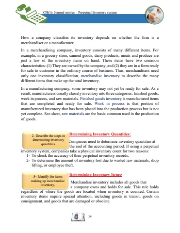 CH(1): Journal entries %u2013Perpetual Inventory system14How a company classifies its inventory depends on whether the firm is a merchandiser or a manufacturer. In a merchandising company,inventory consists of many different items. For example, in a grocery store, canned goods, dairy products, meats and produce are just a few of the inventory items on hand. These items have two common characteristics: (1) They are owned by the company, and (2) they are in a form ready for sale to customer in the ordinary course of business. Thus, merchandisers need only one inventory classification, merchandise inventory to describe the many different items that make up the total inventory.In a manufacturing company, some inventory may not yet be ready for sale. As a result, manufacturers usually classify inventory into three categories: finished goods, work in process, and raw materials. Finished goods inventory is manufactured items that are completed and ready for sale. Work in process is that portion of manufactured inventory that has been placed into the production process but is not yet complete. See sheet, raw materials are the basic commonused in the production of goods.Determining Inventory Quantities:Companies need to determine inventory quantities at the end of the accounting period. If using a perpetual inventory system, companies take a physical inventorycountfor two reasons:1-To check the accuracy of their perpetual inventory records.2-To determine the amount of inventory lost due to wasted raw materials, shop lifting, or employee theft.Determining Inventory Items:Merchandise inventory includes all goods that a company owns and holds for sale. This rule holds regardless of where the goods are located when inventory is counted. Certain inventory items require special attention, including goods in transit, goods on consignment, and goods thatare damaged or obsolete. 2-Describe the steps in determining inventory quantities.3-Identify the items making up merchandise inventory.