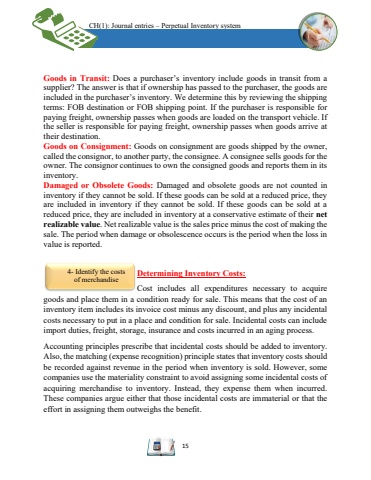 CH(1): Journal entries %u2013Perpetual Inventory system15Goods in Transit:Does a purchaser%u2019s inventory include goods in transit from a supplier? The answer is that if ownership has passed to the purchaser, the goods are included in the purchaser%u2019s inventory. We determine this by reviewing the shipping terms: FOB destination or FOB shipping point. If the purchaser is responsible for paying freight, ownershippasses when goods are loaded on the transport vehicle. If the seller is responsible for paying freight, ownership passes when goods arrive at their destination.Goods on Consignment:Goods on consignment are goods shipped by the owner, called the consignor, to another party, the consignee. A consignee sells goods for the owner. The consignor continues to own the consigned goods and reports them in its inventory. Damaged or ObsoleteGoods:Damaged and obsolete goods are not counted in inventory if they cannot be sold. If these goods can be sold at a reduced price, they are included in inventory if they cannot be sold. If these goods can be sold at a reduced price, they are included in inventory at a conservative estimate of their net realizable value. Net realizable value isthesales price minus the cost of making the sale. The period when damage or obsolescence occurs is the period when the loss in value is reported.Determining Inventory Costs:Cost includes all expenditures necessary to acquire goods and place them in a condition ready for sale. This means that the cost of an inventory item includes its invoice cost minus any discount, and plus any incidental costs necessary to put in a place and condition for sale. Incidental costs can include import duties, freight, storage, insurance and costs incurred in an aging process.Accounting principles prescribe that incidental costsshouldbe added to inventory. Also, the matching (expense recognition) principle states that inventory costs should be recorded against revenue in the period when inventory is sold. However, some companies use the materiality constraint to avoid assigning some incidental costs of acquiring merchandise to inventory. Instead, they expense them when incurred. These companies argue either that those incidental costs are immaterial or that the effort in assigning them outweighs the benefit.4-Identify the costs of merchandise inventory.