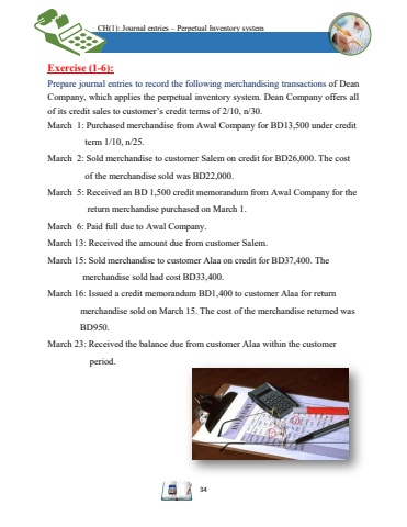 CH(1): Journal entries %u2013Perpetual Inventory system34Exercise(1-6):Prepare journal entries to record the following merchandising transactions of Dean Company, which applies the perpetual inventory system. Dean Company offers all of its creditsales to customer%u2019scredit terms of 2/10, n/30. March1: Purchased merchandise from Awal Company for BD13,500 under credit term 1/10, n/25.March 2: Sold merchandise to customerSalemon credit for BD26,000.The cost of the merchandise sold was BD22,000.March5: Received an BD 1,500 credit memorandum fromAwal Company forthe return merchandise purchased on March1.March 6: Paid full due to Awal Company.March13: Received the amount due from customer Salem.March 15: Sold merchandise to customer Alaa on credit for BD37,400.The merchandise sold had costBD33,400. March 16: Issued a credit memorandum BD1,400 to customer Alaa for return merchandise sold on March15. The cost of the merchandise returned was BD950.March 23: Received the balance due from customer Alaa within the customer period.