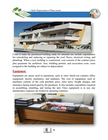Ch(4):Depreciation of Plant Assets89Costs to make thepurchasedbuilding ready for intended use include expenditures for remodeling and replacing or repairing the roof, floors, electrical wiring, and plumbing. When a new building is constructed, cost consists of the contract price plus payments for architects%u2019 fees, buildingpermits, and excavation costs.costs assigned to the building are subject to depreciation.EquipmentEquipment areassets used in operations, such as store check-out counters office equipment,factory machinery, and airplanes. The cost of equipment, such as machinesconsists of the cash purchase price, sales taxes, freight charges, and insurance during transit paid by the purchaser. It also includes expenditure required in assembling, installing, and testing the unit. Once equipment isinuse, any maintenance expenses are treated as operating expenses.
