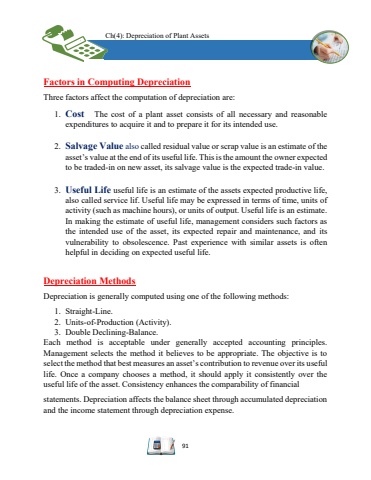 Ch(4):Depreciation of Plant Assets91Factors in Computing DepreciationThree factors affect the computation of depreciation are:1.CostThe costof a plant assetconsists of all necessary and reasonable expenditures to acquire it and to prepare it for its intended use.2.Salvage Valuealsocalled residual value or scrap valueis an estimate of the asset%u2019s value at the end of its useful life. This is the amount the owner expected to be traded-in on new asset,its salvage value is the expected trade-in value.3.Useful Lifeuseful life is an estimate of theassetsexpected productive life, also calledservice lif. Useful life may be expressed in terms of time, units of activity (such as machine hours), or units of output. Useful life is an estimate.In making the estimateof useful life, management considers such factors as the intended use of the asset, its expected repair and maintenance, and its vulnerability to obsolescence. Past experience with similar assets is often helpful in deciding on expected useful life.Depreciation MethodsDepreciation is generally computed using one of the following methods:1.Straight-Line.2.Units-of-Production (Activity).3.Double Declining-Balance.Each method is acceptable under generally accepted accounting principles. Management selects the method it believes to be appropriate. The objective is to select the method that best measures an asset%u2019s contribution to revenue over its useful life. Once a company chooses a method, it should apply it consistently over the useful life of the asset. Consistency enhances the comparability of financial statements. Depreciation affects the balance sheet through accumulated depreciation and theincome statement through depreciation expense.