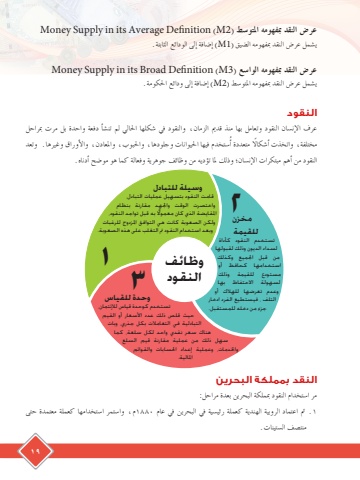 19وحدة للقياستستخدم كوحدة قياس لإلئتمان، حيث قلص ذلك عدد األسعار أو القيم التبادلية في التعامالت بكل جذري، وبات هناك سعر نقدي واحد لكل سلعة، كما سهل ذلك من عملية مقارنة قيم السلع واخلدمات، وعملية إعداد احلسابات والقوائم املالية. مخزن للقيمةتستخدم النقود كأداة لسداد الديون وذلك لقبولها من قبل اجلميع وكذلك استخدامها كحافظ أو مستودع للقيمة وذلك لسهولة االحتفاظ بها وعدم تعرضها للهالك أو التلف ، فيستطيع الفرد ادخار جزء من دخله للمستقبل.وسيلة للتبادلقامت النقود بتسهيل عمليات التبادل، واختصرت الوقت واجلهد مقارنة بنظام املقايضة الذي كان معمواًلً به قبل تواجد النقود، ولكن الصعوبة كانت هي التوافق املزدوج للرغبات وبعد استخدام النقود مت التغلب على هذه الصعوبة.عر�ض النقد مبفهومه املتو�سط (M2 (Definition Average its in Supply Moneyي�شمل عر�ض النقد مبفهومه ال�ضيق )M1 )إ�ضافة إىل الودائع الثابتة.عر�ض النقد مبفهومه الوا�سع (M3 (Definition Broad its in Supply Moneyي�شمل عر�ض النقد مبفهومه املتو�سط )M2 )إ�ضافة إىل ودائع احلكومة.النقودعرف الإن�سان النقود وتعامل بها منذ قدمي الزمان، والنقود يف �شكلها احلايل مل تن�شأ دفعة واحدة بل مرت مبراحل ُ�ستخدم فيها احليوانات وجلودها، واحلبوب، واملعادن، والأوراق وغريها. وتعد خمتلفة، واتخذت أ�شكالاً متعددة أالنقود من أهم مبتكرات الإن�سان؛ وذلك ملا تؤديه من وظائف جوهرية وفعالة كما هو مو�ضح أدناه.النقد بمملكة البحرينمر ا�ستخدام النقود مبملكة البحرين بعدة مراحل:1 .مت اعتماد الروبية الهندية كعملة رئي�سية يف البحرين يف عام 1880م، وا�ستمر ا�ستخدامها كعملة معتمدة حتى منت�صف ال�ستينات.وظائفالنقود123