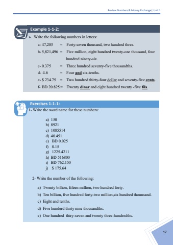 Review Numbers & Money Exchange│ Unit117►Write the following numbers in letters:a-47,203 = Forty-seven thousand, two hundred three.b-5,821,496 = Five million, eight hundred twenty-one thousand, four hundred ninety-six.c-0.375 = Three hundred seventy-five thousandths.d-4.6 = Four andsix-tenths.e-$ 234.75= Two hundred thirty-four dollarand seventy-five cents.f-BD 20.825= Twenty dinarand eight hundred twenty -five fils.Example 1-1-2:1-Write the word name for these numbers:a)150 b)8921c)1085514 d)40.451e)BD 0.025f)8.15g)1225.4211 h)BD 516800i)BD 762.150 j)$ 175.642-Write the number of the following:a)Twenty billion, fifeen million, two hundred forty.b)Ten billion, five hundred forty-two million,six hundred thounsand.c)Eight and tenths.d)Five hunderd thirty nine thousandths.e)One hundred thiry-seven and twenty three-hundredths.Exercises1-1-1: