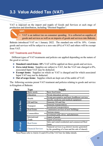 Review Numbers & Money Exchange│ Unit1773.3 Value Added Tax (VAT)VAT is imposed on the import and supply of Goods and Services at each stage of production and distribution, including “Deemed Supplies”.Bahrain introduced VAT on 1 January 2022. The standard rate will be 10%.Certain goods and services will be subject to a zero-rate (0%) of VAT and others will be exempt from VAT.VAT Treatments and PoliciesDifferent types of VAT treatments and policiesare applied depending on the nature of the good or service.►Standard rated items:10% VAT will be applied on these goods and services.►Zero-rated items:Supplies are subject to VAT, but the VAT rate charged is 0%, associated Input VAT may be deducted.►Exempt items:Supplies on which no VAT is charged and for which associated Input VAT may not be deducted.►Out of scope items:Supplies which are kept out of the ambit of VAT.The following sectoins presnt VAT treatment and policies relating to goods and service in Kingdom of Bahrain:RateTypeSupplyZero-RateBasic needsBasic food itemsEducationPrivate deucation servicesHealthPrivate preventative and basic healthcare servicesSpecific medicine and medical equipment Oil and GasDomestic Oil and GasTransport Domestic transportation Inernational transportation Real EstateConstructon services of new buildingsCommodities Precious stonesInvestment gold, silver,and platimumInternational Trade Export of goodsExport of sevicesExemptReal Estate Sales and rental residential and commercial Real EstateFinancial ServicesFinancial services (e.g.interest income generated by the grandting of a loan and the sale of shared)Note:Please refer to Aticle (1) and (53) of the VAT law for futher details.►VAT is an indirect tax on consumer spending. It is collected on supplies of goods and services as well as on imports of goods and services into Bahrain.VAT: